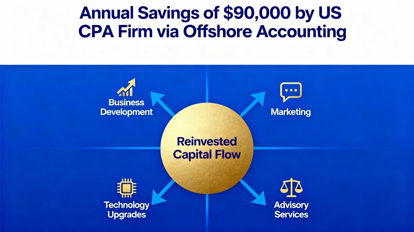 These savings are not just line-item cuts; they free capital which firms reinvest in business development, marketing, technology upgrades, or expanding advisory services. For example, one US CPA firm cut $90,000 annually by replacing two local bookkeepers with an offshore team, enabling reinvestment to win 8 new clients.