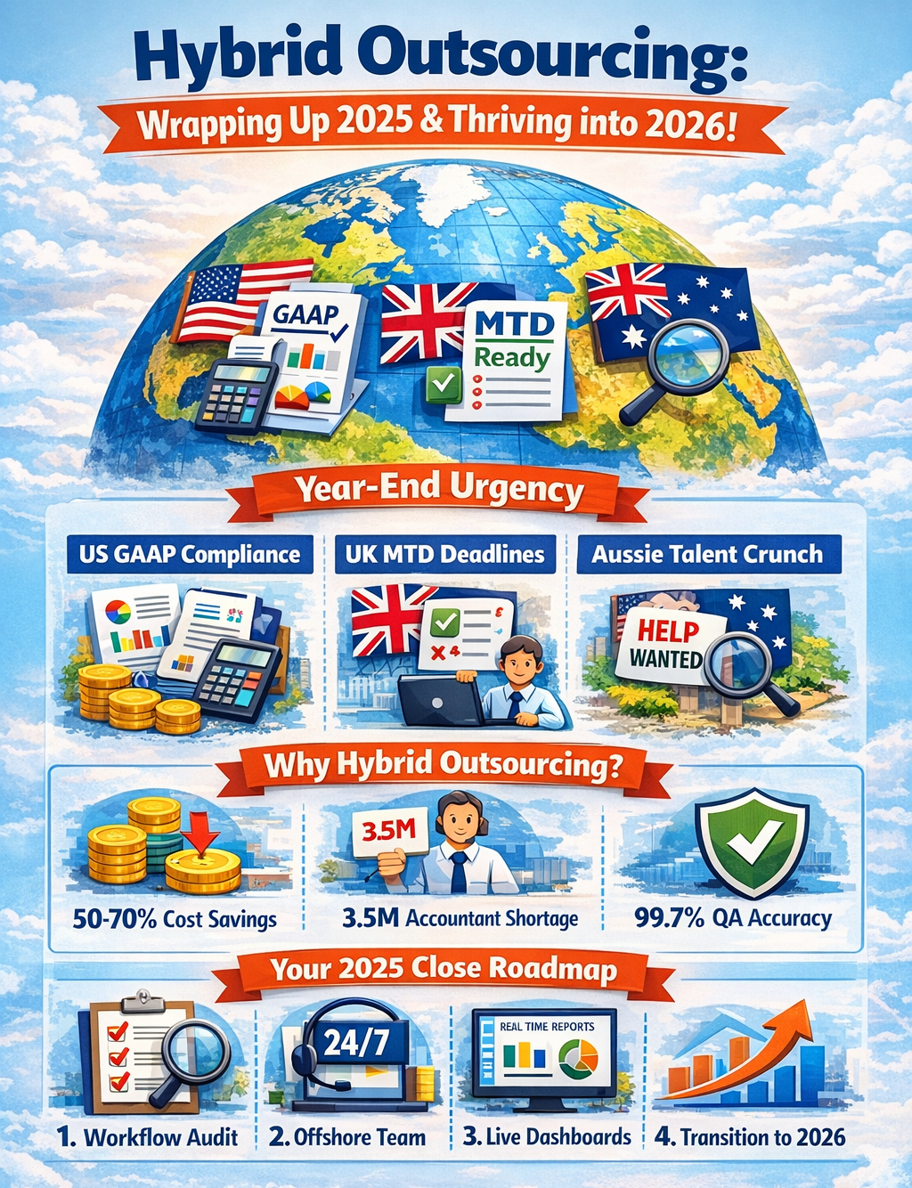 As 2025 draws to a close, hybrid outsourcing models have solidified as the game-changer for US CPA firms, UK traders facing Making Tax Digital (MTD) deadlines, and Australian SMEs battling talent shortages and high costs. With year-end pressures peaking month-end closes, tax filings, and 2026 planning over 40% of CFOs report adopting these models for immediate 50-70% cost savings via offshore accounting. FinRecon Global Services stands ready to help you close out strong, outsourcing routine bookkeeping, reconciliations, and payroll to offshore teams while you focus on strategic growth into the new year.