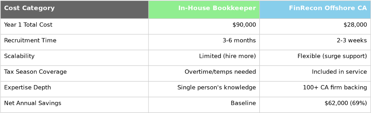 The standard solution? Hire another in-house bookkeeper. But a spreadsheet on your other monitor shows a different path: an offshore CA with 15 years of experience for $28,000 annually. That’s a $62,000 difference. The question isn’t whether offshore accounting vs in-house bookkeeper cost matters—it’s whether you can afford to ignore a 69% cost reduction while your competitors are already calculating their ROI.